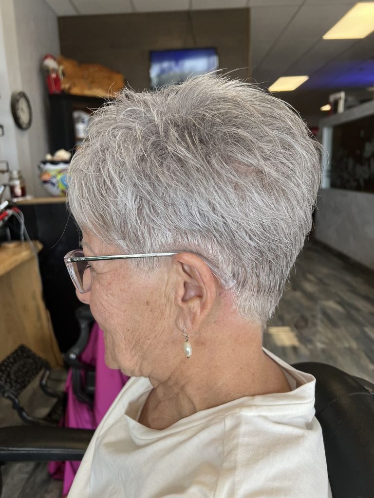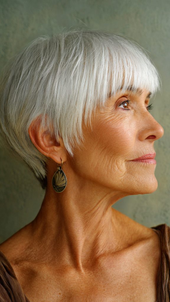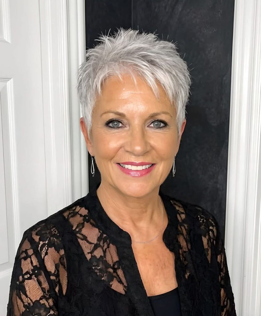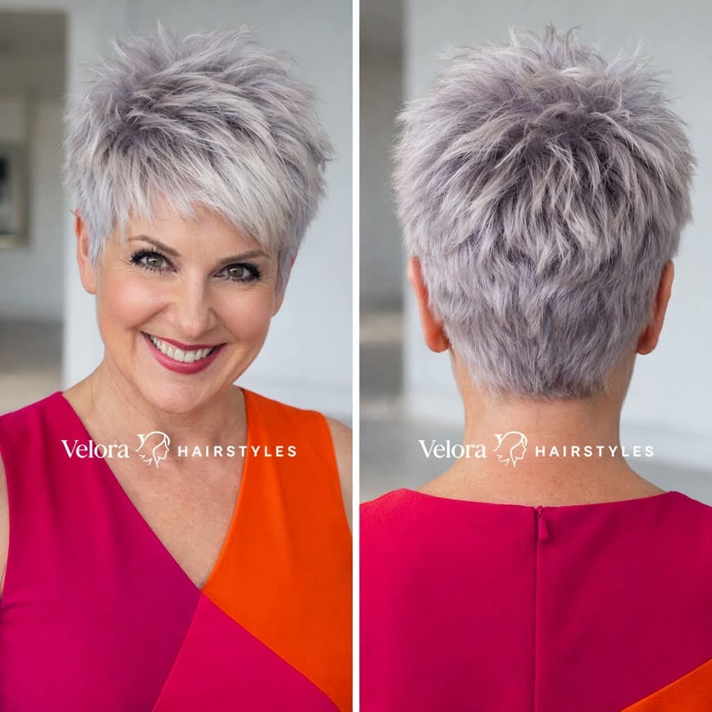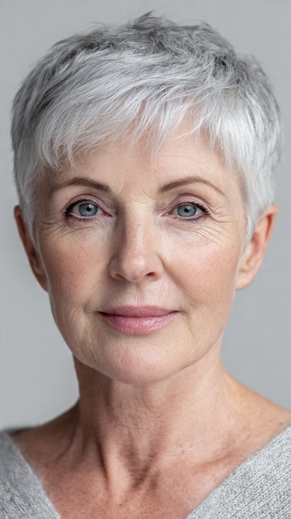 Why it works: A short, textured pixie cut is a timeless favorite for a reason. It removes weight from thinning hair, creates instant volume at the crown, and highlights your natural silver or white tones.