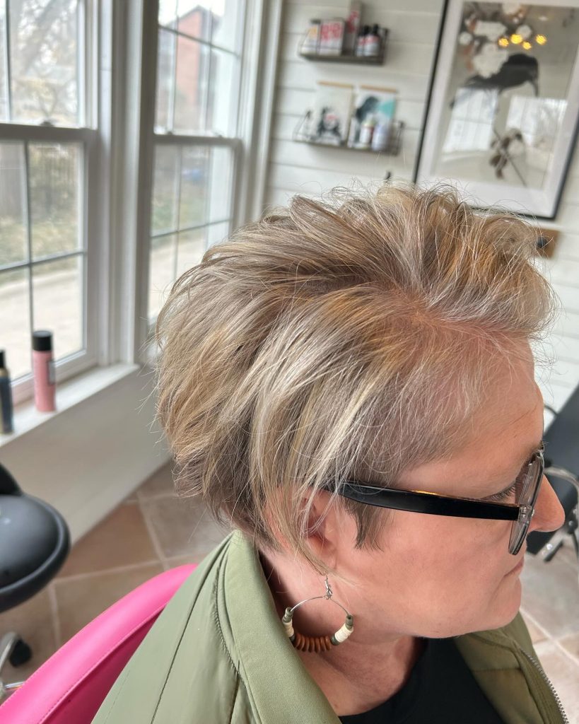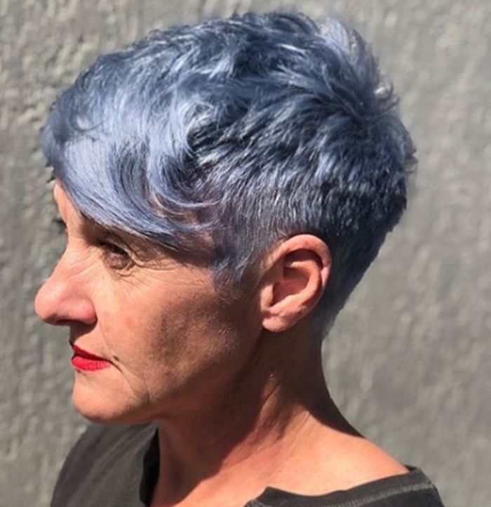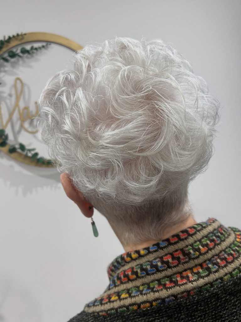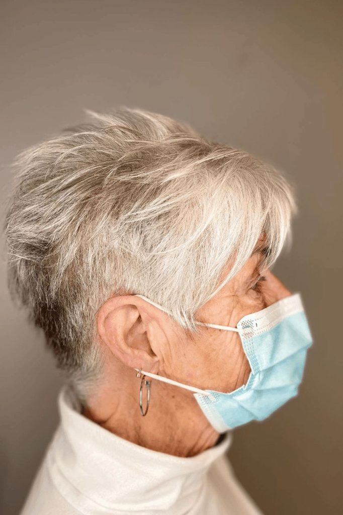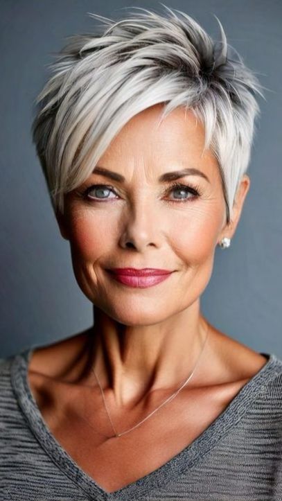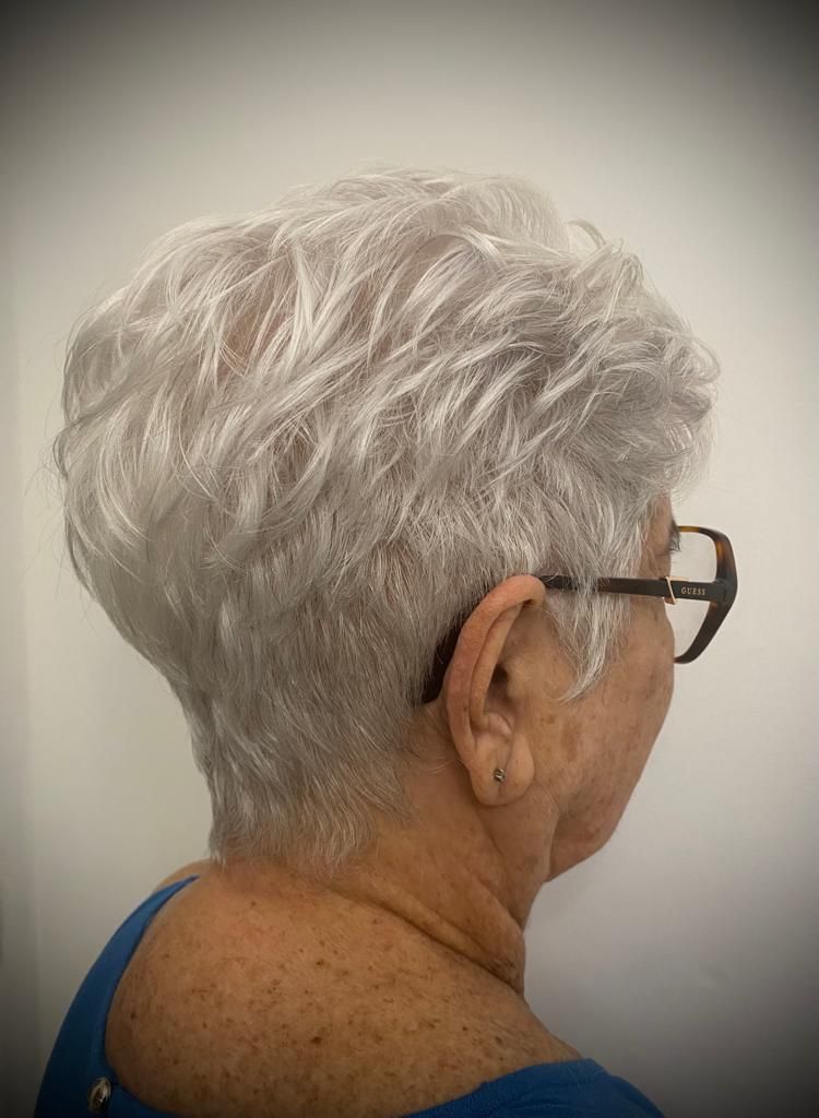 Why it works: A short, textured pixie cut is a timeless favorite for a reason. It removes weight from thinning hair, creates instant volume at the crown, and highlights your natural silver or white tones.