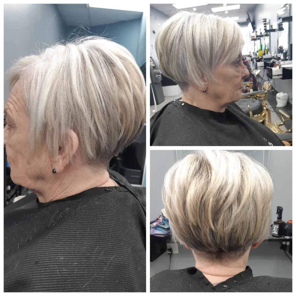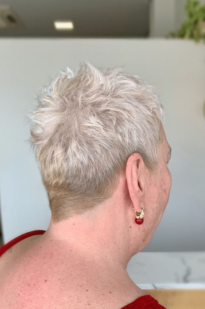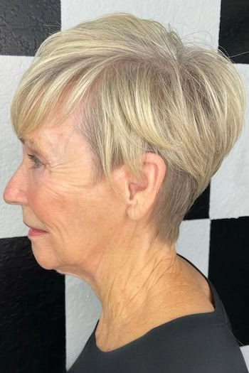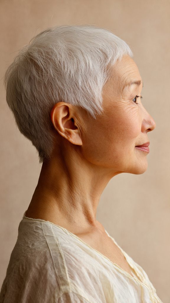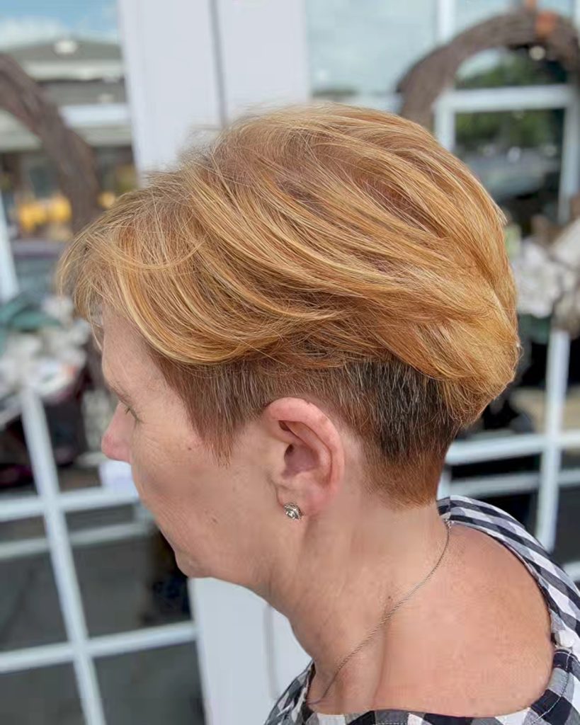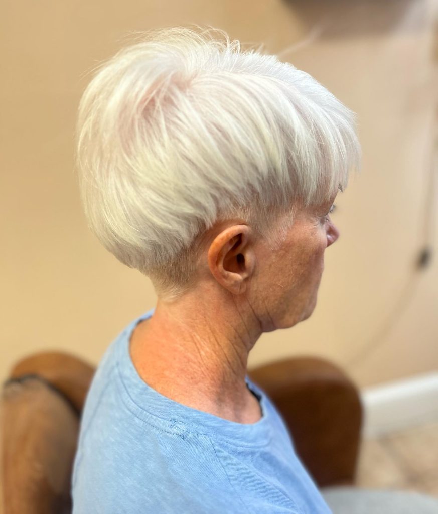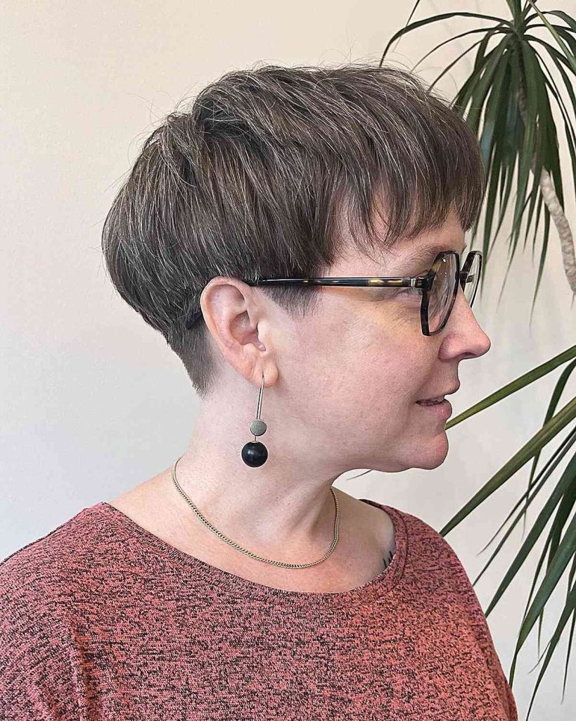 Why it works: This cut is very short at the nape of the neck (often faded or tapered) with slightly more length on top. It’s cooling, comfortable, and ideal for women who wear glasses or hearing aids.