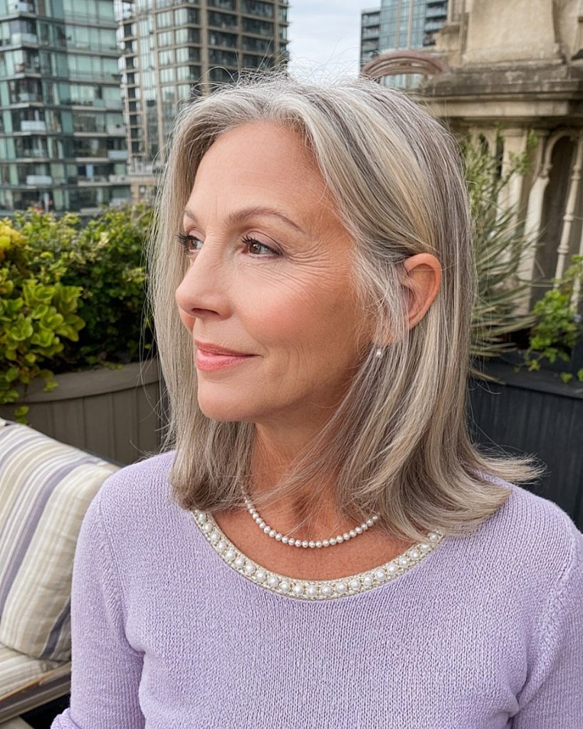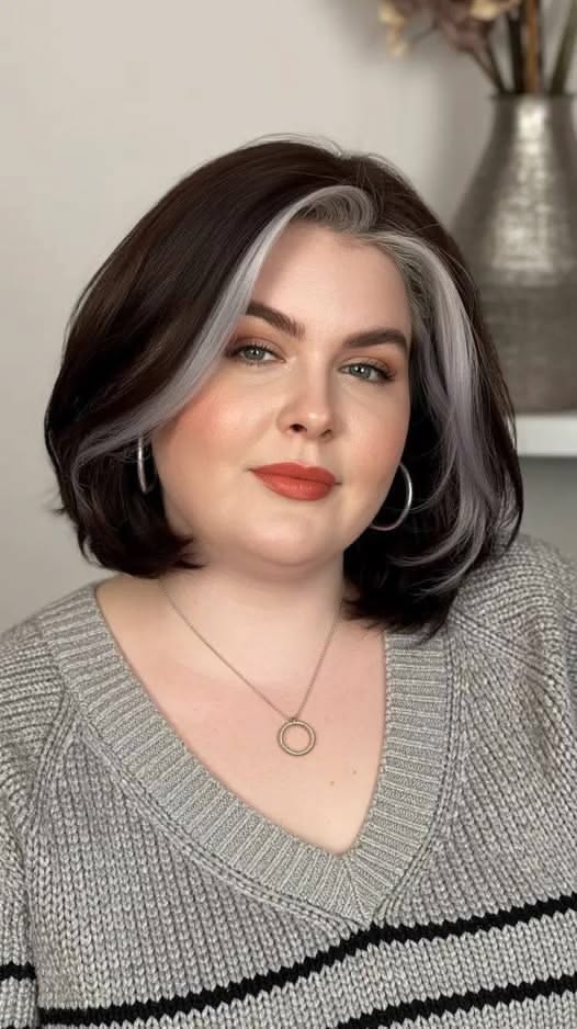 This style offers a clean, understated approach to the hybrid cut, perfect for straight hair textures. The length falls just below the ears, featuring a subtle curve that hugs the jawline for a softening effect. With integrated grey and white tones, the look is natural and low-maintenance. The light, airy fringe across the forehead provides a gentle frame for the face, making this an elegant, everyday option that balances simplicity with a modern silhouette.