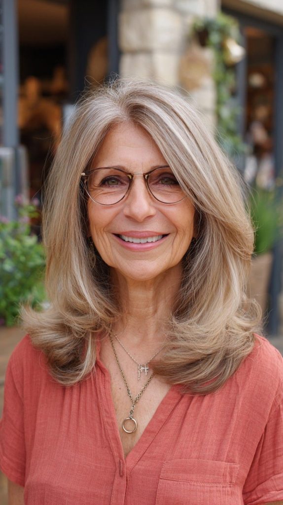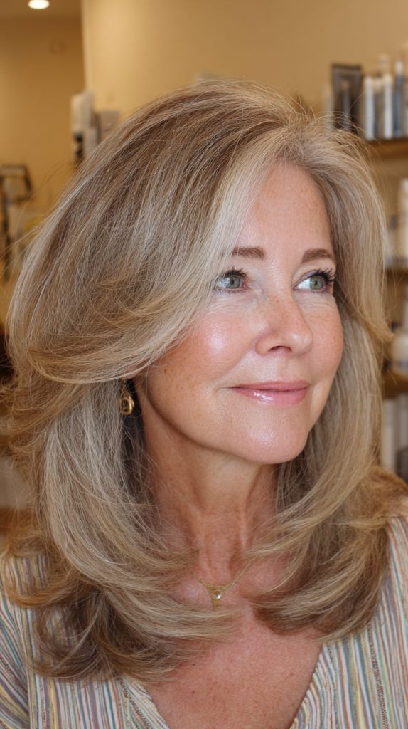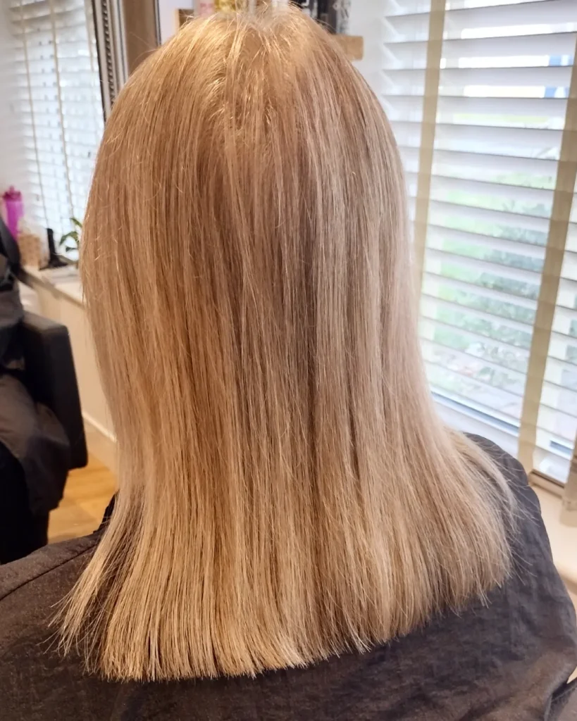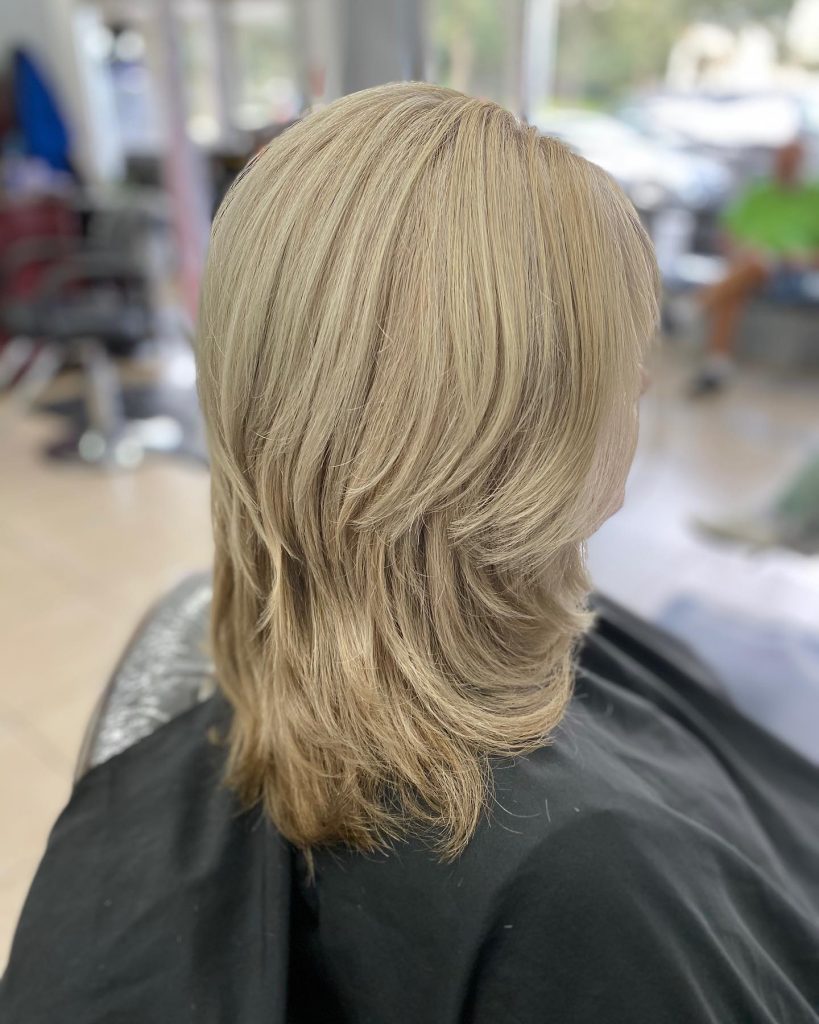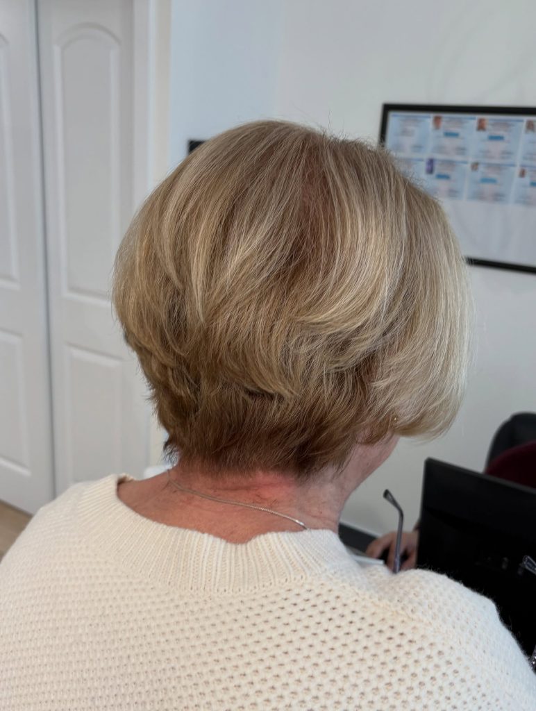 This view highlights the structural foundation and the classic “stacked” technique. The hair at the nape of the neck is cut short and graduated to support the longer layers above, creating a natural lift and a rounded, voluminous shape at the back of the head. The honey-blonde tones are blended through smooth, overlapping layers that offer a clean, architectural profile that remains easy to maintain as it grows out.