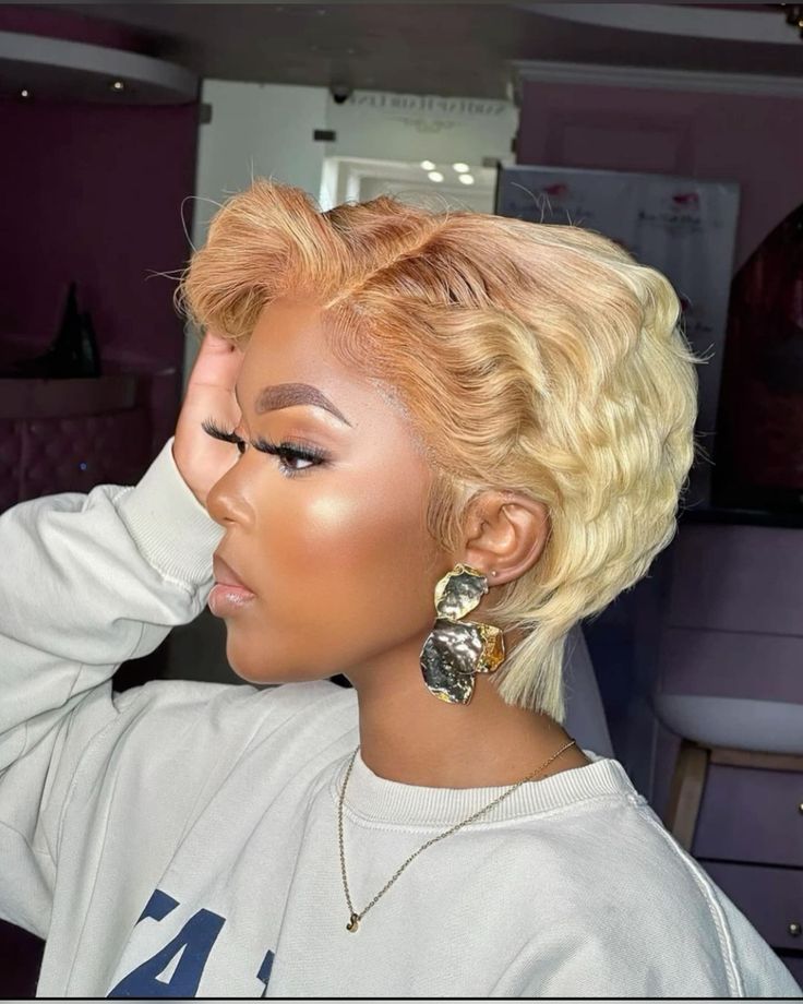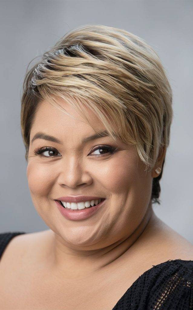This style brings a contemporary, slightly edgy twist to the bob pixie by incorporating elements of a shag. The hair features warm honey-blonde tones with distinct, piecey layers that flip out slightly at the nape. The crown is kept full and voluminous, while the sides are tucked back to reveal the ear, creating a multi-dimensional look that feels effortless and youthful.