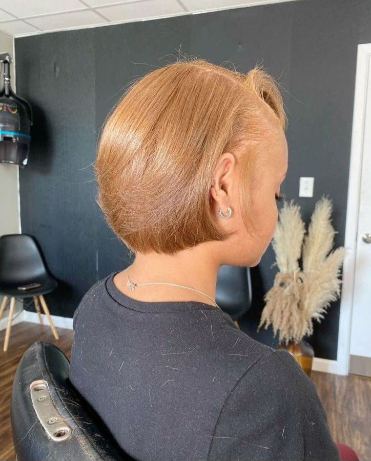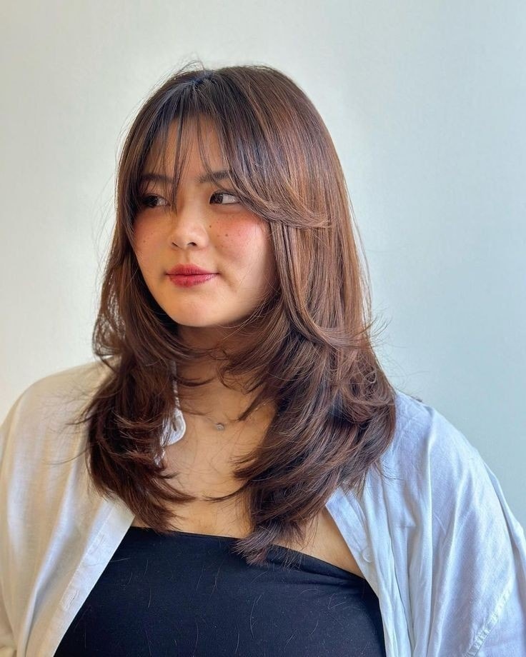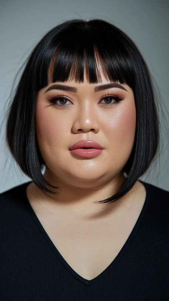 This style demonstrates the power of a rich, monochromatic tone paired with a sleek silhouette. The hair is cut with smooth, internal layers that provide a rounded, voluminous shape at the back while maintaining a flat, polished finish on the surface. A distinct, elongated side-piece is left in front of the ear to add a touch of modern asymmetry and frame the jawline. This version is an excellent choice for those with thicker hair who want to eliminate weight while keeping a look that feels substantial and high-fashion.