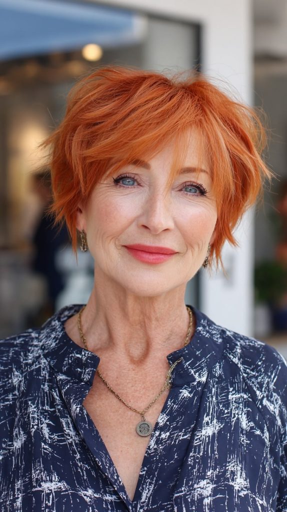 In this interpretation, the cut is transformed into a high-volume, “lived-in” style with a vibrant copper tone. It leans heavily into the pixie’s edgy roots, using piecey, feathered layers throughout the crown to create height and dimension. The fringe is cut with a wispy, eyelash-skimming length that adds a playful, modern energy. It’s an ideal choice for adding the appearance of thickness to hair through strategic texture and bold color.