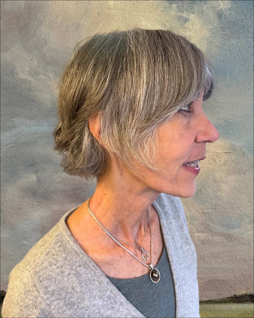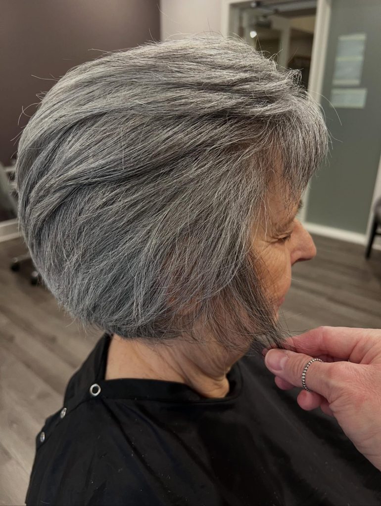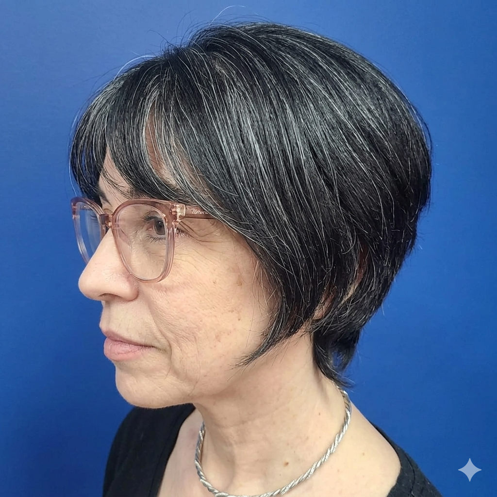 This variation leans closer to a traditional bob but incorporates the lightweight layering of a pixie at the back and sides. The hair features a multi-tonal ash-grey blend, styled with a soft, side-swept fringe that blends seamlessly into the longer side sections. By keeping the length slightly longer toward the front and tapering it gently at the nape, this cut provides a balanced look that offers the coverage of a bob with the manageable weight of a shorter crop.