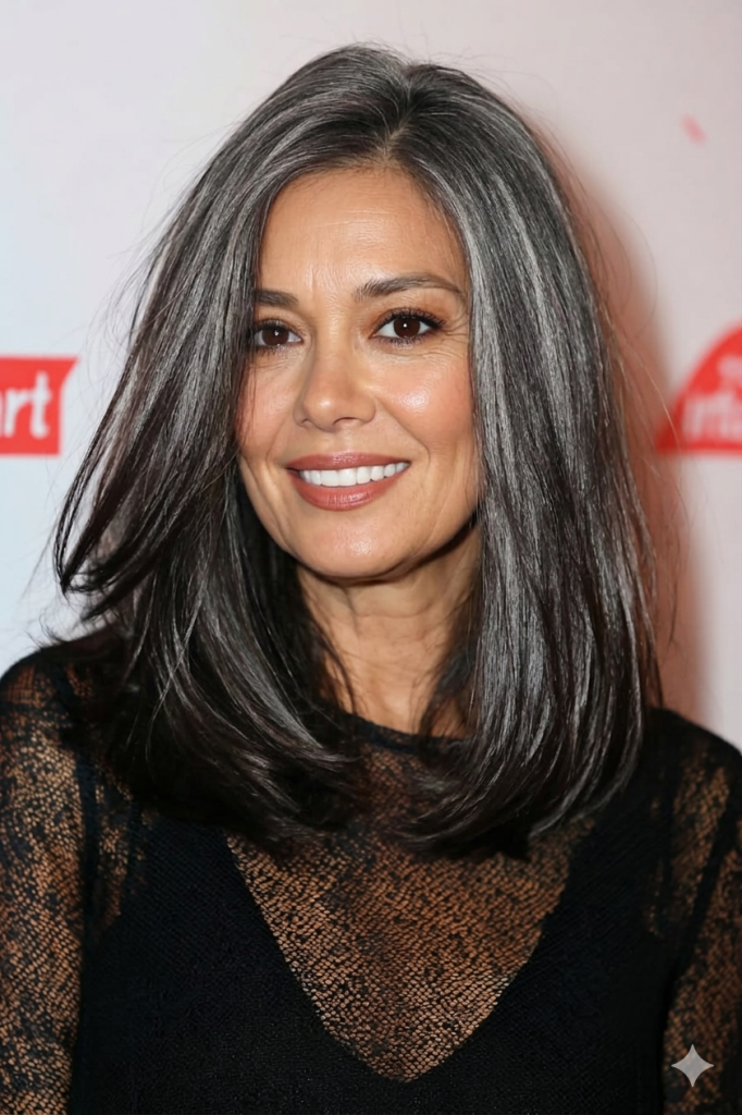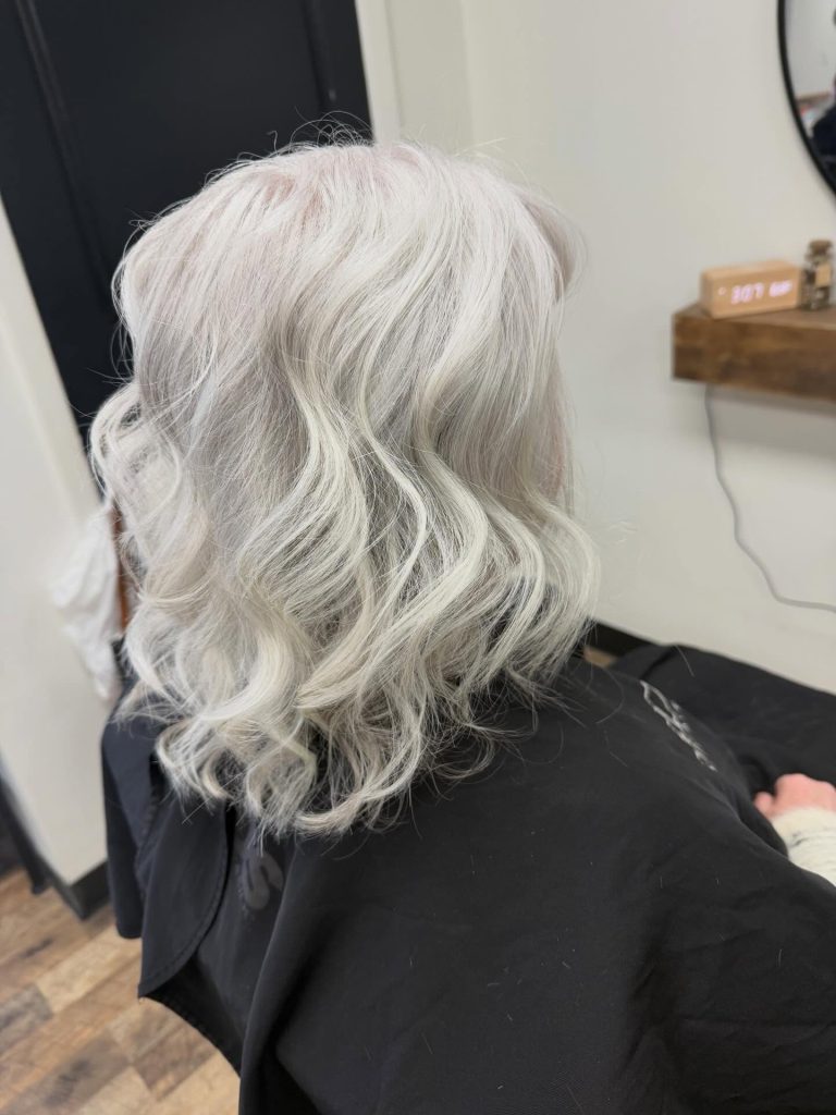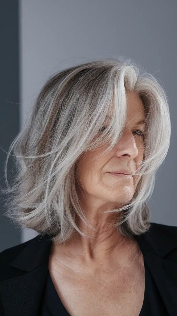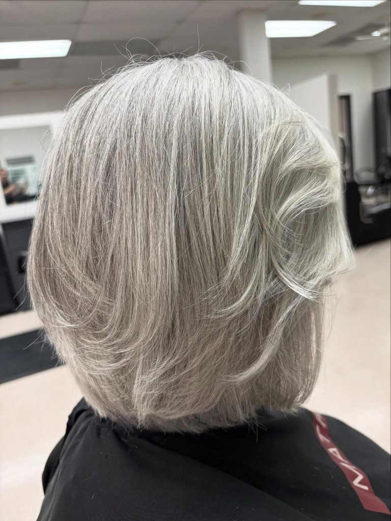 This profile showcases a masterfully layered back that provides incredible lift and volume. The “stacked” effect at the nape of the neck creates a structural foundation, while the longer, ash-grey layers on top cascade down to a sharp, forward-swept point. This silhouette is ideal for adding body to finer hair textures, offering a profile that looks architectural and voluminous from every angle.