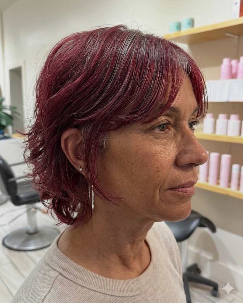 In this bold interpretation, the bob pixie is elevated by a deep, monochromatic wine-red hue. The cut features longer, face-framing layers and a “bottleneck” fringe that opens up the face. The texture is piecey and undone, with the back layers left long enough to graze the collarbone, offering a more bohemian and spirited take on the traditional short crop.