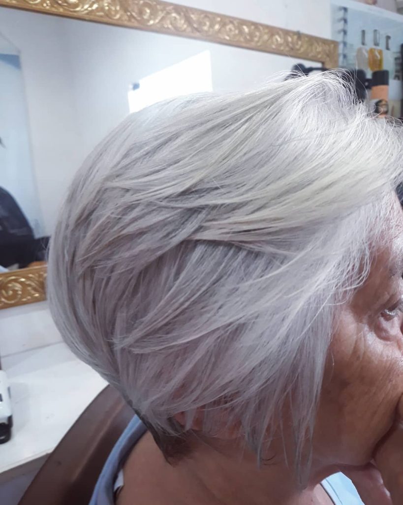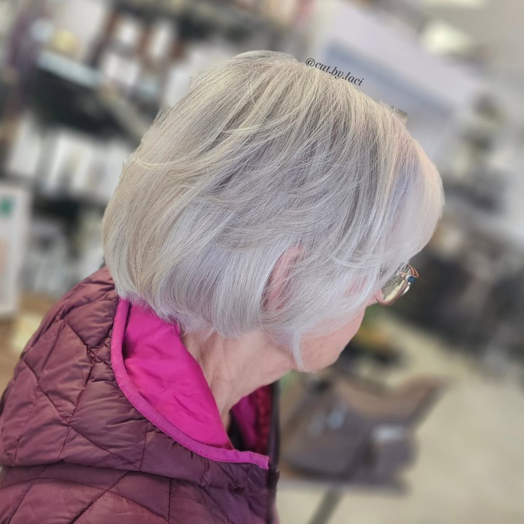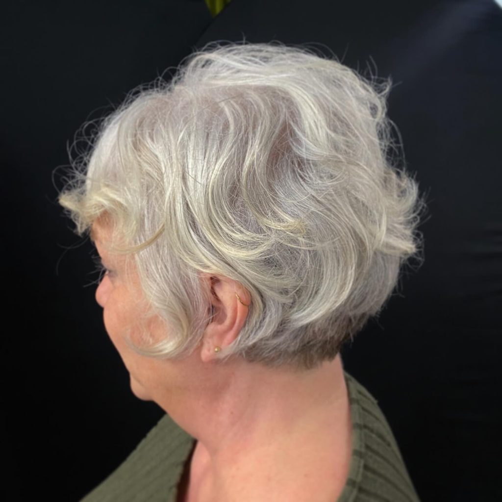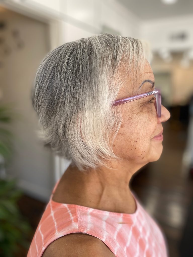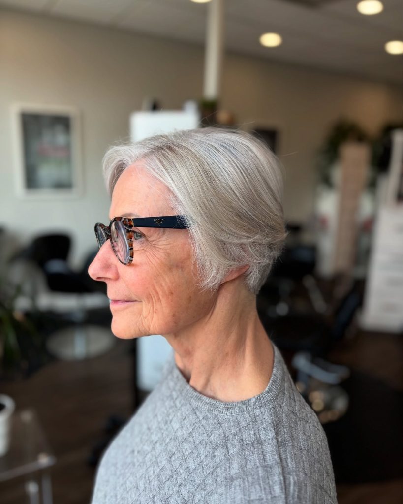 This profile highlights a lighter, more ethereal take on the bixie cut. The silver-grey hair is styled with a soft, outward-flipping layer at the cheekbone, mimicking the delicate shape of a wing. The back and sides are kept quite short and close to the head, which emphasizes the length and movement of the top sections. It is a graceful and modern choice that opens up the face and works beautifully with eyewear, offering a look that feels both weightless and intentional.