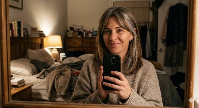 4. Soft Curtain Bangs on a Gray-Blended Lob — The Bedroom Mirror Selfie