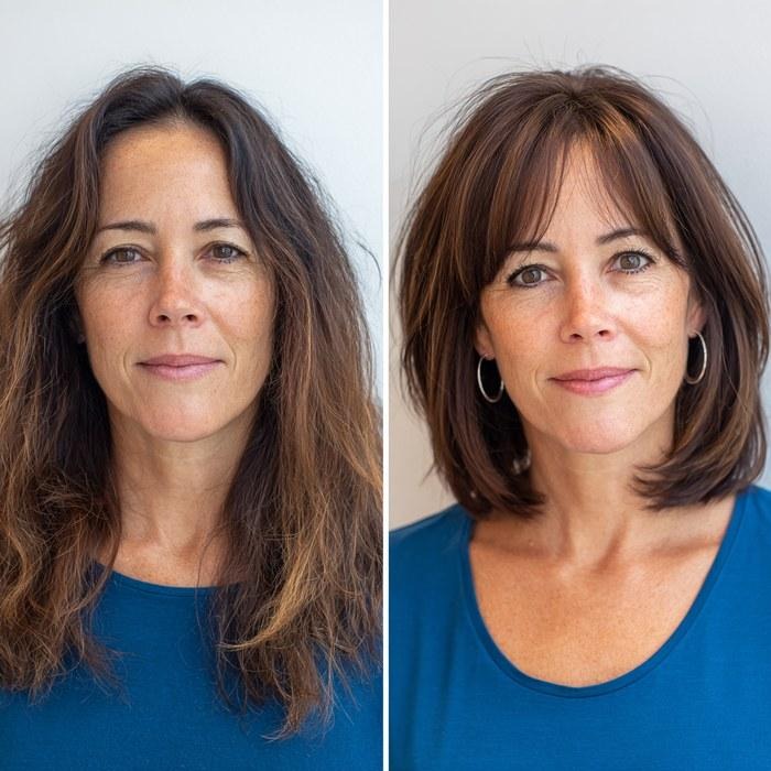 This transformation is the most relatable one in the article: long, slightly overwhelming brunette hair with no real shape — versus a beautifully framed shorter bob with curtain bangs. The bangs alone lift the whole face. The shorter length removes the weight. Together, they take years off without touching a single anti-aging product.