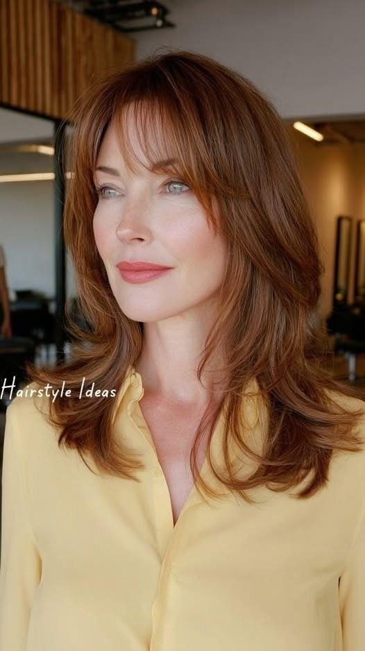 Long copper layers with curtain bangs is a look that simply glows in real life. The fringe adds a face-framing element to what would otherwise be a straightforward long hairstyle — and the difference is enormous. This is the style for women over 40 who love their length but want their hair to feel more purposeful and modern in 2026.