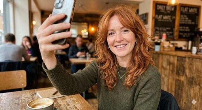 Brunette bob with curtain bangs — natural daylight selfie, completely real