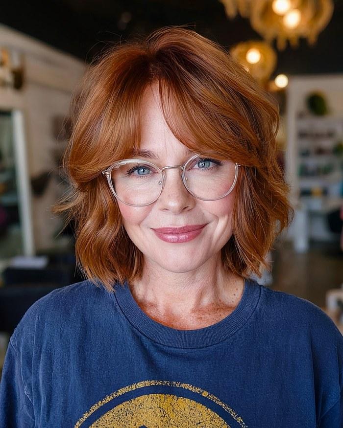 Copper wavy bob with curtain bangs and glasses — proves bangs and specs work beautifully together
