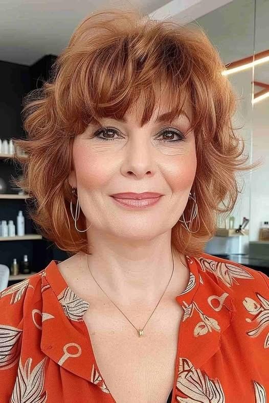 For women who love a little drama in their haircut, this short wavy shag with copper curtain bangs delivers. The combination of the wispy fringe and the voluminous shaggy layers creates a bold, textured look that still feels feminine and age-appropriate. The warm copper tone adds incredible dimension without needing heavy highlighting.