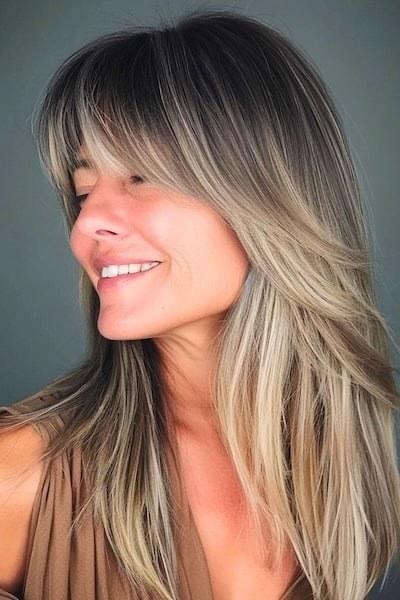 Ash blonde long layers with soft curtain fringe — the side profile shows how seamlessly they blend