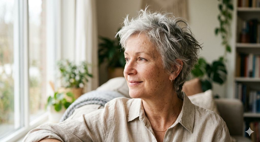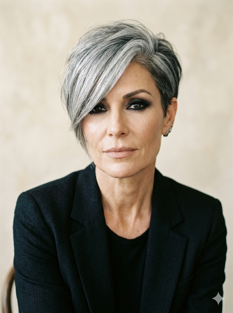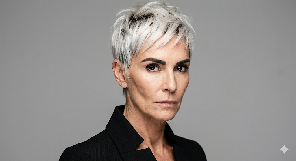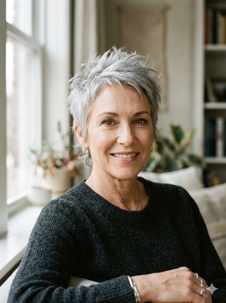 In this article, I’m sharing all nine styles – plus the exact AI prompts I used to visualize them before going to my stylist. Whether you’re fully gray, still coloring, or rocking silver roots with a platinum crop, there’s a choppy pixie here with your name on it.