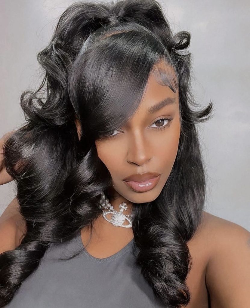 This hairstyle offers a refined take on the high ponytail by incorporating a heavy, swooping side bang that lays flat across the forehead. The base of the ponytail is wrapped for a seamless finish, while the lengths are styled into large, bouncy curls that rest over one shoulder. The combination of a slicked-back crown and voluminous, textured ends creates a dynamic silhouette that is both secure for a night of dancing and undeniably glamorous for the red carpet.