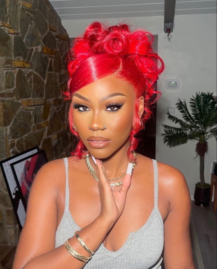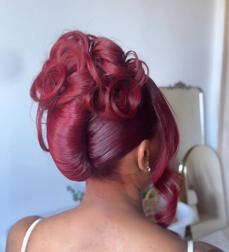 This look is a celebration of vivid color and vintage-inspired architectural styling. The hair is swept upward into a series of intricate, defined pin curls that create a mohawk-like crown of texture and volume. The front is styled with a sharp, sleek side-swept bang that lays perfectly flat, highlighting the precision of the hairline and the intensity of the crimson shade. With its blend of retro charm and modern hair artistry, this style is ideal for a bold, fashion-forward prom look that demands attention.