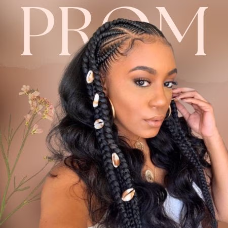 Blending cultural heritage with contemporary prom fashion, this style features neat, curved cornrows that sweep back into a voluminous half-up silhouette. The defining characteristic is the addition of polished cowrie shells and silver rings woven into the accent braids, creating a regal and rhythmic aesthetic. Large, soft waves fall over one shoulder to provide a sense of softness and movement. This look is an ideal choice for a celebratory milestone, offering a secure and artistic silhouette that remains flawless from the first photo to the last dance.