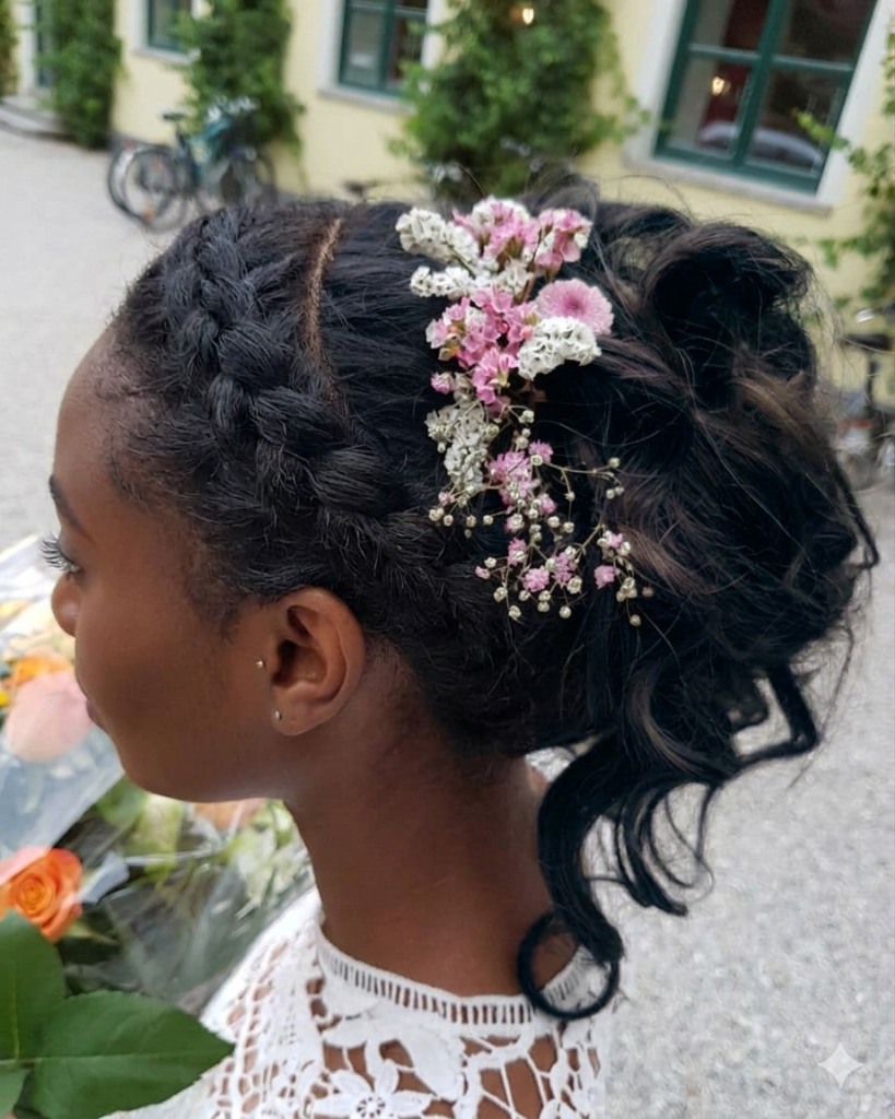 The braided crown offers a regal and organic aesthetic, incorporating thick, neat plaits that wrap around the head to create a natural tiara. This look is elevated with the addition of fresh baby’s breath and soft pink floral sprigs, which are woven into the hair for a delicate, whimsical finish. The remaining hair is gathered into a soft, textured bun at the back, striking a perfect balance between artisanal craftsmanship and ethereal beauty. This style is particularly effective for outdoor or garden-themed prom events.