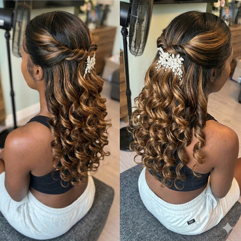 This style celebrates the beauty of defined, spiral curls, accented by warm caramel highlights that provide a multidimensional finish. The top half is pinned back securely to create a clean silhouette at the front, anchored by a prominent silver floral barrette that adds a regal, vintage-inspired touch. The remaining curls fall in uniform, springy ringlets over the shoulders, offering a look that is both structured and romantic. It is a quintessential prom style that provides a secure, polished feel throughout the evening.