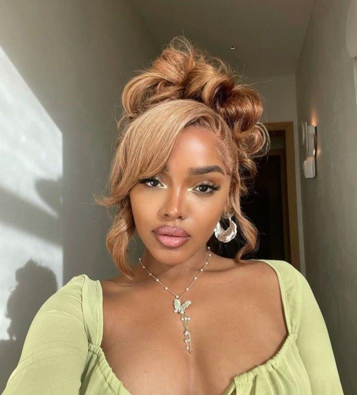This look is a masterclass in dimension, utilizing a warm honey-blonde palette to highlight the intricate layering of a high updo. The hair is gathered into a series of soft, voluminous loops at the crown, while a thick, side-swept bang adds a modern, polished edge. To soften the overall silhouette, long, loose curls are left to cascade around the face, creating a romantic and ethereal frame. It is a sophisticated choice for prom that balances the height of a formal updo with the movement of a down style.