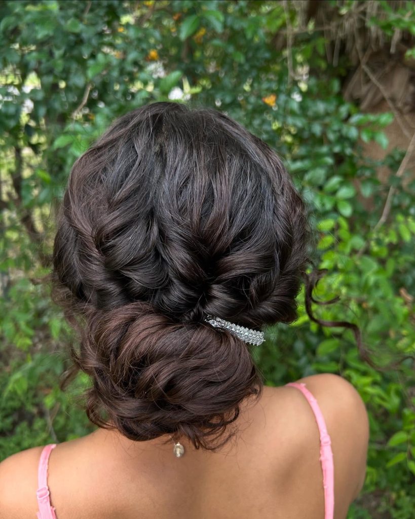 For a timeless and understated aesthetic, this low-slung chignon focuses on soft, voluminous texture and effortless grace. The hair is loosely gathered at the nape of the neck, with layered waves throughout the crown adding depth and a lived-in feel. A minimalist crystal hairpiece is tucked into the side, providing a subtle touch of sparkle that catches the light without overwhelming the look. It is a refined, classic choice that pairs beautifully with open-back gowns and delicate jewelry.