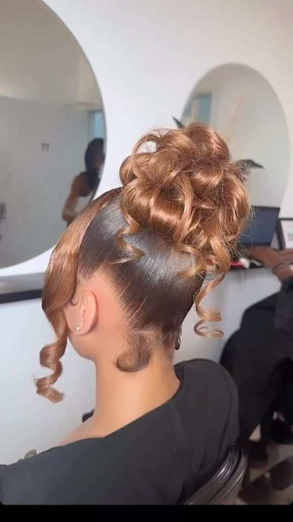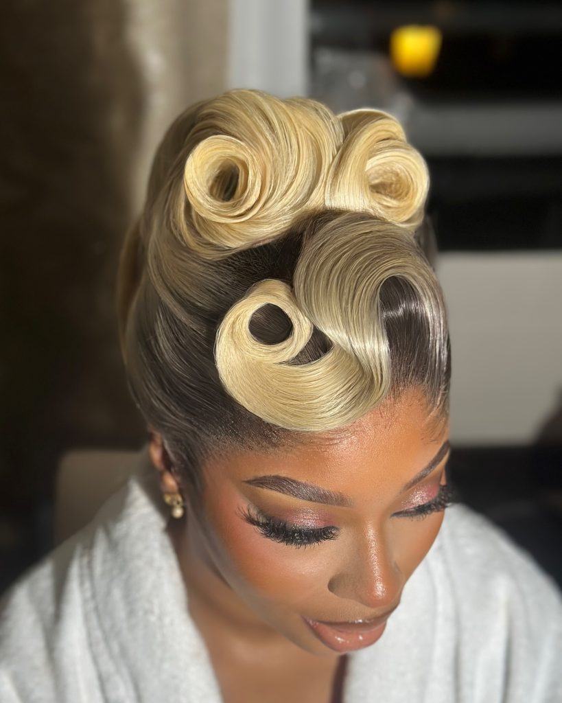 For the trendsetter seeking a truly unique prom look, this sculptural updo uses high-contrast blonde and brunette tones to define its architectural shape. The hair is molded into large, seamless pin curls that sit prominently at the front and crown, creating a “wave” effect that is both vintage and futuristic. The precision of the bicolor transition accentuates the curves of the style, making it a standout choice for those who view their hairstyle as a piece of wearable art.