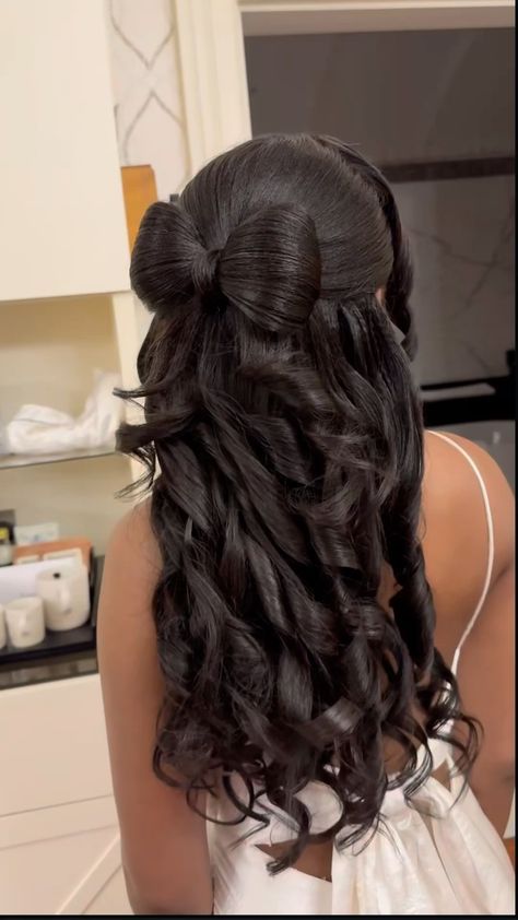 Channeling a sense of playful elegance, this style features a stunning hair bow sculpted entirely from the wearer’s own tresses. The top half of the hair is pulled back into this structural centerpiece, while the remaining lengths fall in glossy, perfectly defined ringlets down the back. This “half-up” approach offers the best of both worlds—keeping the hair away from the face to showcase makeup and jewelry while maintaining the dramatic length of a full-down look. It is a whimsical yet polished aesthetic that feels both youthful and high-fashion.