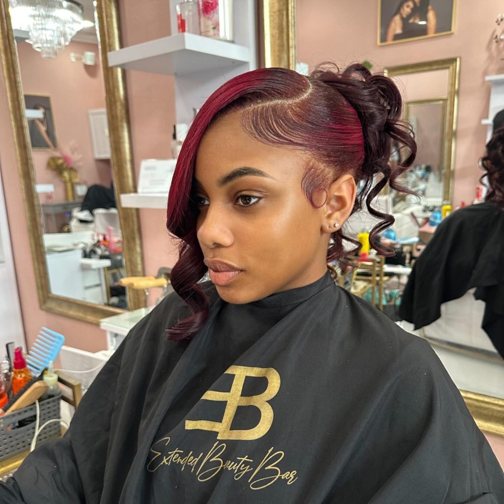 Deep jewel tones bring a sophisticated, moody elegance to this high-contrast look. The hair is pulled back into a voluminous, textured ponytail at the crown, while a sleek side bang is swept across the forehead in a vibrant burgundy hue. The attention to detail is evident in the expertly laid edges, which are styled into delicate swirls to frame the face. The result is a polished, modern updo that feels both intentional and fashion-forward, ideal for making a statement under the ballroom lights.