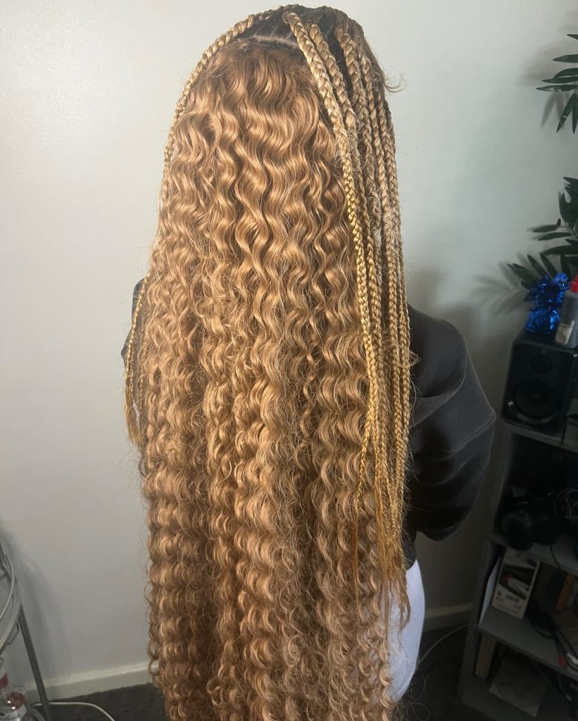 This look is a striking fusion of protective styling and mermaid-length texture, featuring a warm honey-blonde palette that adds a sun-kissed radiance. The top section is intricately braided into neat goddess plaits that transition seamlessly into a waterfall of long, deep-wave curls cascading down the back. This style offers incredible movement and volume, making it a perfect choice for those who want a dramatic, high-impact aesthetic that balances the precision of braids with the softness of flowing texture.
