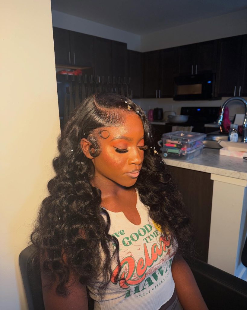 This look centers on the luxurious texture of deep, uniform waves that cascade past the shoulders, offering a high-shine finish that radiates sophistication. The focal point is the intricate hairline work, where edges are expertly swooped into delicate, circular patterns that transition seamlessly into a sharp side part. Small, golden hair charms are tucked into the parting, adding a subtle glimmer that elevates the style for a formal evening. It is a powerful choice for those who want to balance the romanticism of long hair with modern, intentional detailing.