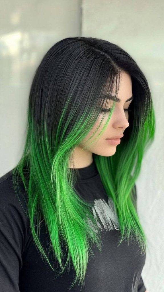 For those looking to make a bold statement, this style utilizes the sleekness of straight hair to showcase a dramatic color transition. The jet-black roots melt seamlessly into a vibrant, neon lime green. The sharp contrast is enhanced by the hair’s smooth finish, which allows the vivid pigment to take center stage. Gentle face-framing layers add a touch of softness to the edgy, high-contrast palette.