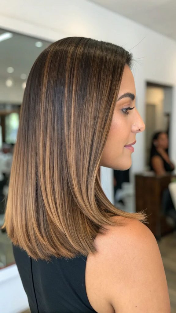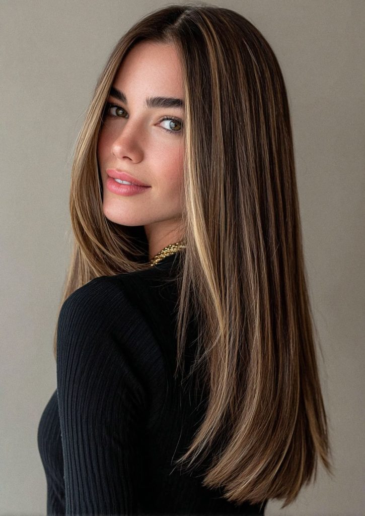 A more layered and dimensional approach to straight hair, this style utilizes soft, caramel-toned highlights to add movement. The hair is cut with long, invisible layers and a prominent, jaw-length face-framing fringe that adds volume around the cheekbones. The finish is smooth but airy, proving that straight hair can maintain incredible body and a soft, “expensive” bounce without the need for curls.