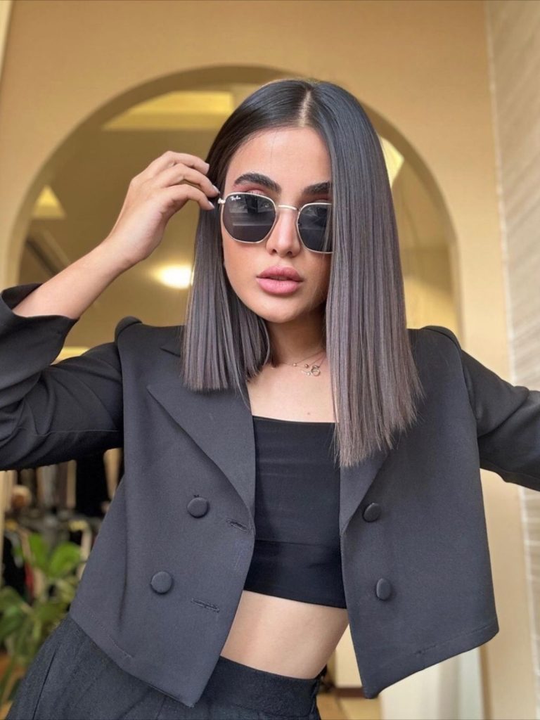 This ultra-chic, shoulder-length long bob (lob) features a unique smoky, ash-toned brunette shade that borders on lavender-grey. The center part and impeccable “glass hair” finish create a highly symmetrical and architectural look. With its sharp, blunt-cut ends and cool-toned palette, this style is a perfect representation of modern, “quiet luxury” aesthetics, offering a sophisticated and slightly moody vibe.