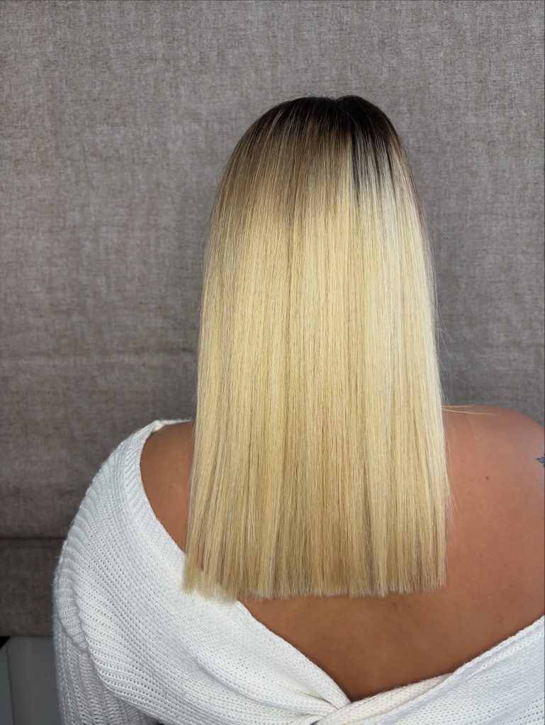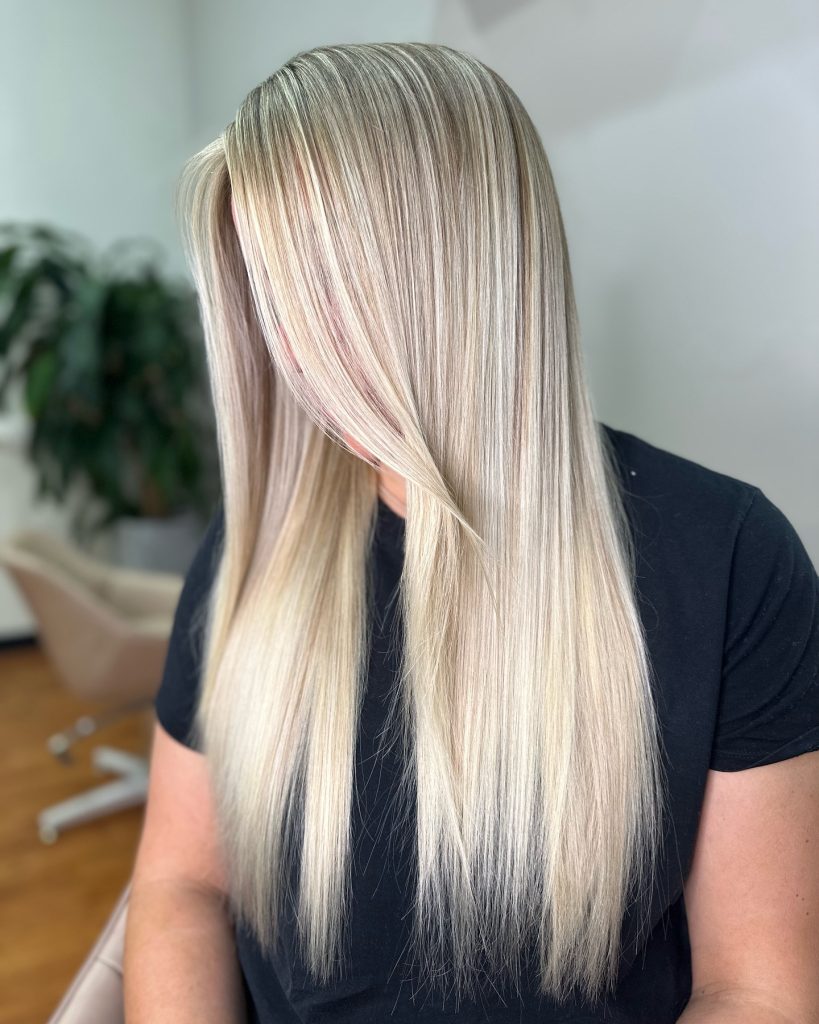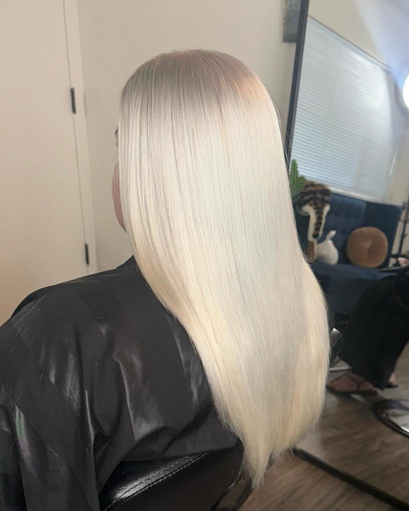 This back-view shot showcases a flawless execution of the “lived-in” platinum trend. The hair transitions beautifully from a cool, smoky shadow root into a bright, icy blonde that radiates with a healthy sheen. The cut features a soft “V” or “U” shape at the ends, which provides a more tapered and fluid movement compared to a traditional blunt cut. By maintaining the natural root color, the style offers a modern, low-maintenance approach to high-contrast blonde, ensuring the hair looks sophisticated even as it grows out. The ultra-smooth texture highlights the precision of the color melt and the overall integrity of the long, straight strands.