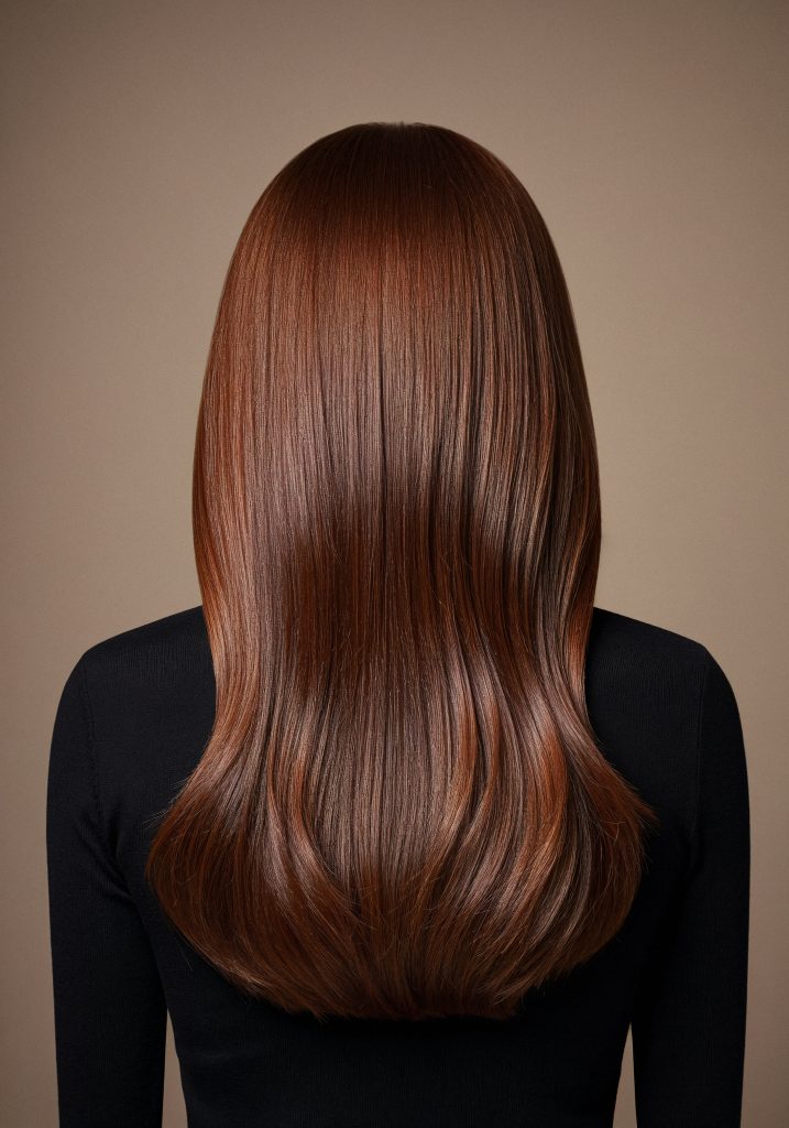 A vibrant example of the “expensive copper” trend, this style features a brilliant, warm ginger hue with incredible saturation. The hair is styled in a middle part with long, unbroken lengths that act as a mirror for the light, showcasing a healthy and vibrant glow. The uniform color and impeccable smoothness create a high-fashion aesthetic that feels both energetic and refined. This look is perfect for highlighting the natural luster that straight hair can achieve through professional color and intentional hydration.