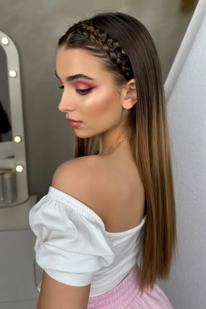 This style blends intricate texture with a smooth finish by incorporating a thick, Dutch-style braid that acts as a natural headband. The warm honey-brown hair is pulled back off the face to highlight the eyes and makeup, while the rest of the hair remains sleek and straight. The contrast between the structural braid and the fluid, straight ends creates a romantic yet modern look that is ideal for formal events or intentional everyday wear.