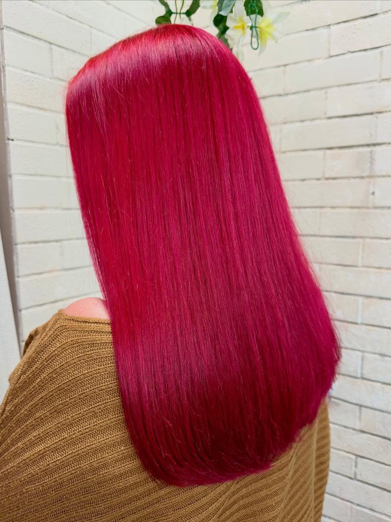 A bold and high-impact style, this mid-length cut showcases a vibrant, monochromatic fuchsia hue. The hair is styled in a perfectly straight, blunt-cut silhouette that emphasizes the density and uniform texture of the strands. Against the backdrop of a neutral setting, the vivid pink-red tone takes center stage, demonstrating how a smooth “glass hair” finish can elevate even the most adventurous of color choices.