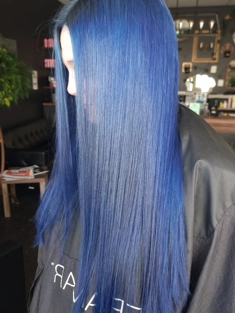 This striking look features deep, denim-blue tones that saturate long, straight strands from root to tip. The color possesses a subtle metallic sheen, which is beautifully highlighted by the hair’s sleek, pin-straight finish. The cut includes soft, wispy ends that add a touch of lightness to the dense, cool-toned palette. It’s a bold, artistic choice that demonstrates how dark, unconventional colors can still feel sophisticated when paired with a polished “glass hair” texture.