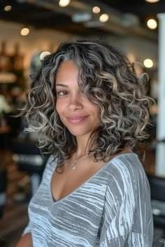 A curly lob with salt-and-pepper or silver blending is one of the most wearable and flattering looks for women over 40. The curl creates volume and movement, the silver adds dimension, and the lob length is universally flattering. It’s the sweet spot for women who love their natural texture but want a polished, intentional look.