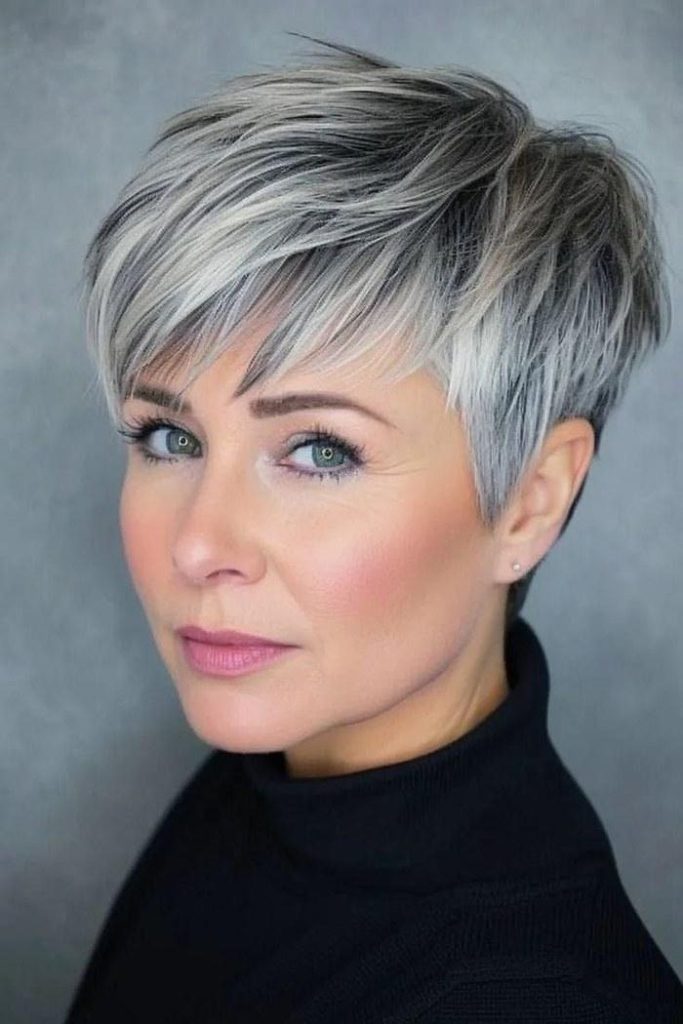 Short hair is one of the boldest and most effective canvases for going silver. Because the length is minimal, the gray blending reads as intentional colour — not neglect. A gray-blended pixie or crop is also the most maintenance-free option: you’re not fighting regrowth on a long canvas, and the shape stays sharp with regular trims every 6–8 weeks.