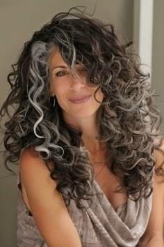 Dark curly hair with silver highlights threaded through — the salt-and-pepper effect is completely natural here