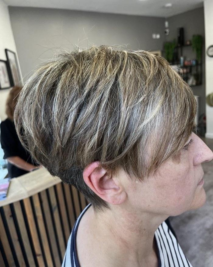 Short pixie with herringbone highlights blending natural gray throughout — requires almost no colour maintenance