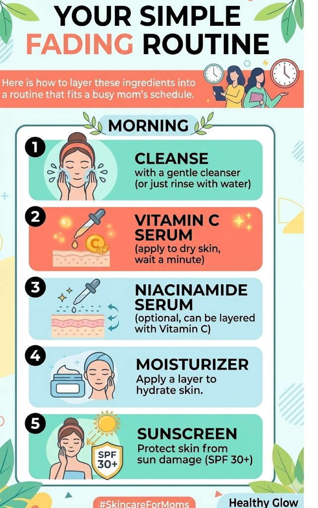 Here is a simple, mom-friendly routine to fade dark spots and even out your skin tone.