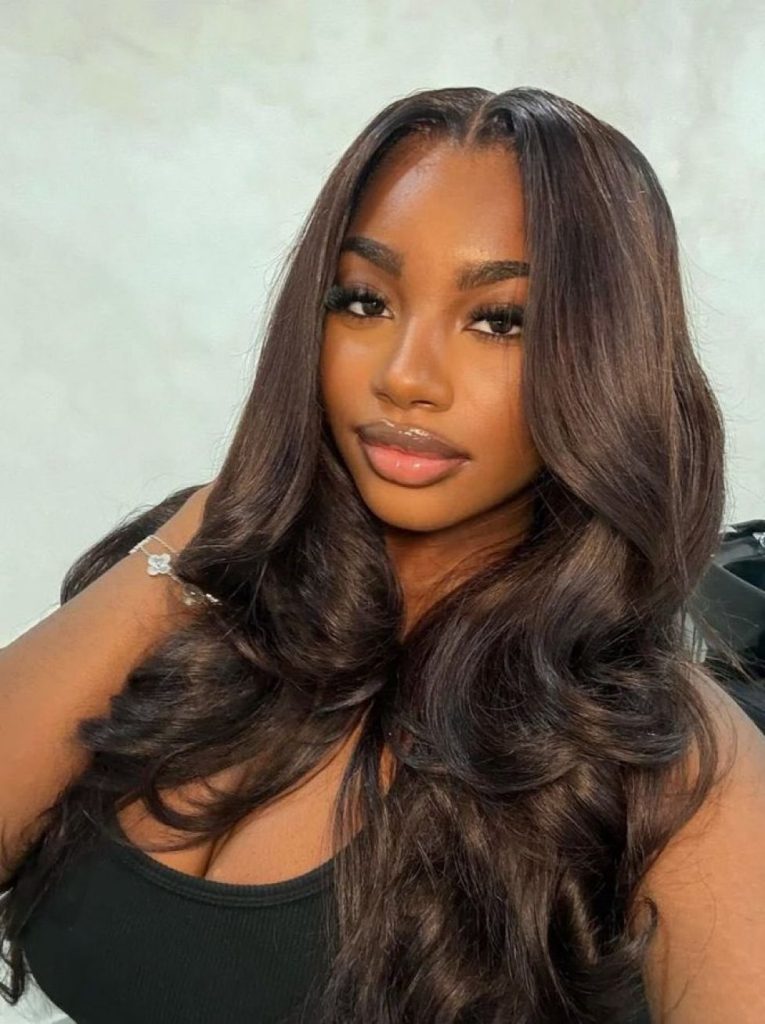 Deep brunette hair featuring connected layers that create effortless fluidity. The internal weight removal ensures a bouncy, high-shine aesthetic.