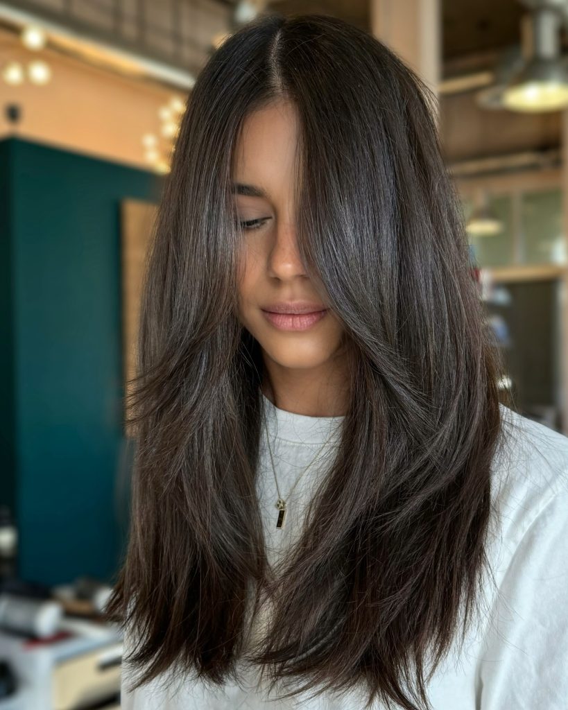 A sophisticated brunette style featuring curtain bangs blended into long layers. The internal shaping adds body and swing to the ends.