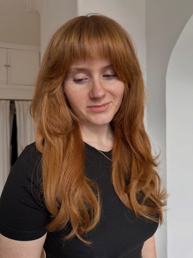 Vibrant copper hair featuring full fringe paired with textured long layers. The internal shaping adds soft movement and body to the mid-lengths.