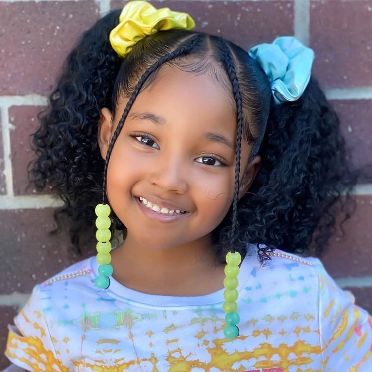 Combining soft, natural volume with secure face-framing accents is a great way to manage hair while letting its texture take center stage. This style features two thin braids at the front hairline that drop down to the shoulders, accented with lime green beads for a touch of fun. The rest of the hair is pulled back into high pigtail puffs and secured with oversized, colorful scrunchies in contrasting yellow and blue. The scrunchies provide a soft, comfortable hold that won’t damage the hair, while the front braids ensure that shorter layers stay out of the eyes throughout the day.