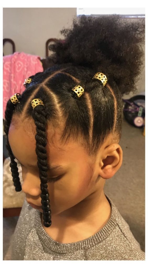 This style combines the practicality of a gathered high puff with the decorative detail of face-framing twists, creating a look that is both durable and visually striking. The hair is sectioned at the front into tidy squares and secured with metallic gold cuffs, which provide a sturdy anchor for the two-strand twists that drape toward the face. By finishing the ends with small black beads, you ensure the twists stay weighted and in place throughout the day, while the remaining hair is swept into a voluminous puff at the crown for maximum comfort. This approach is highly efficient for busy mornings, as it keeps the hair organized and managed while adding a layer of intentional, coordinated detail with very little extra effort.